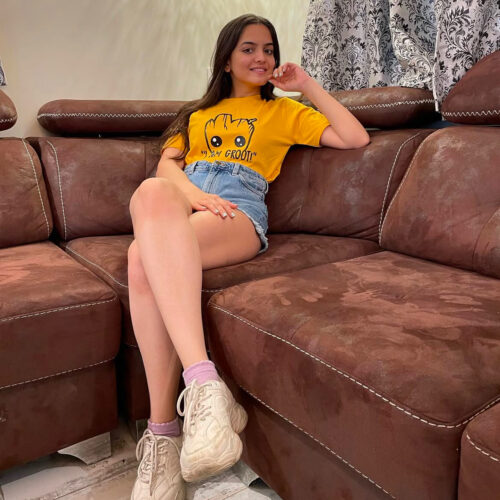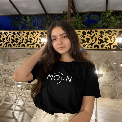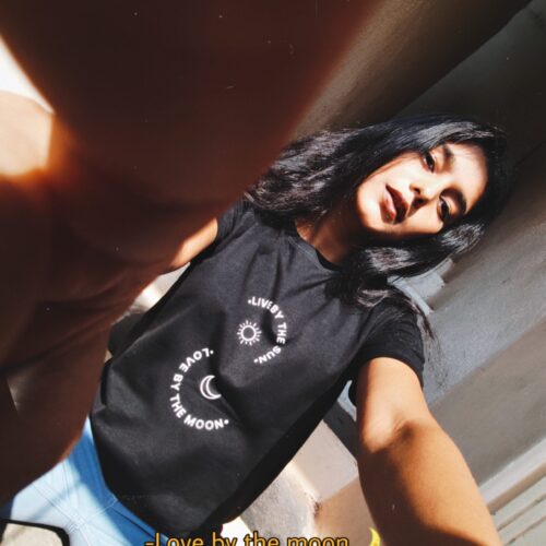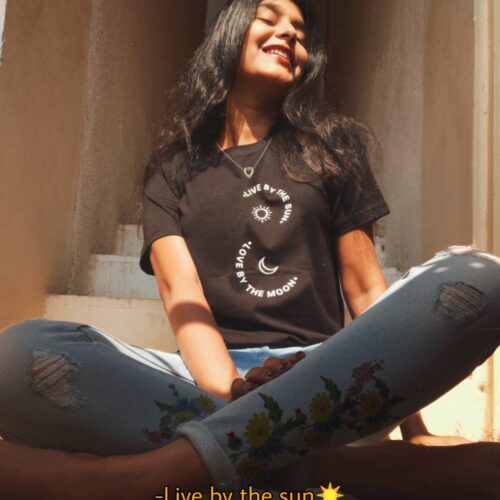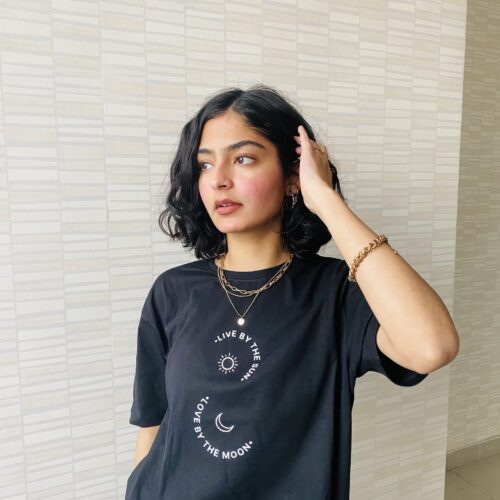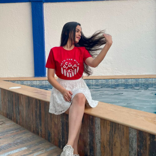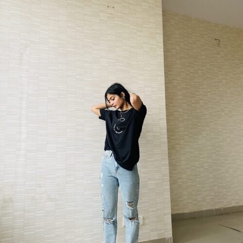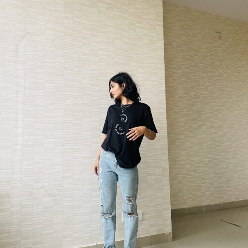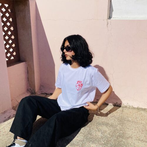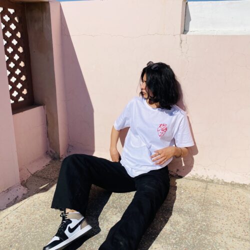 Take cues from Mahek on how to style our bestselling 90’s Girl T-shirt by pairing it with a red jeans and white shoes!